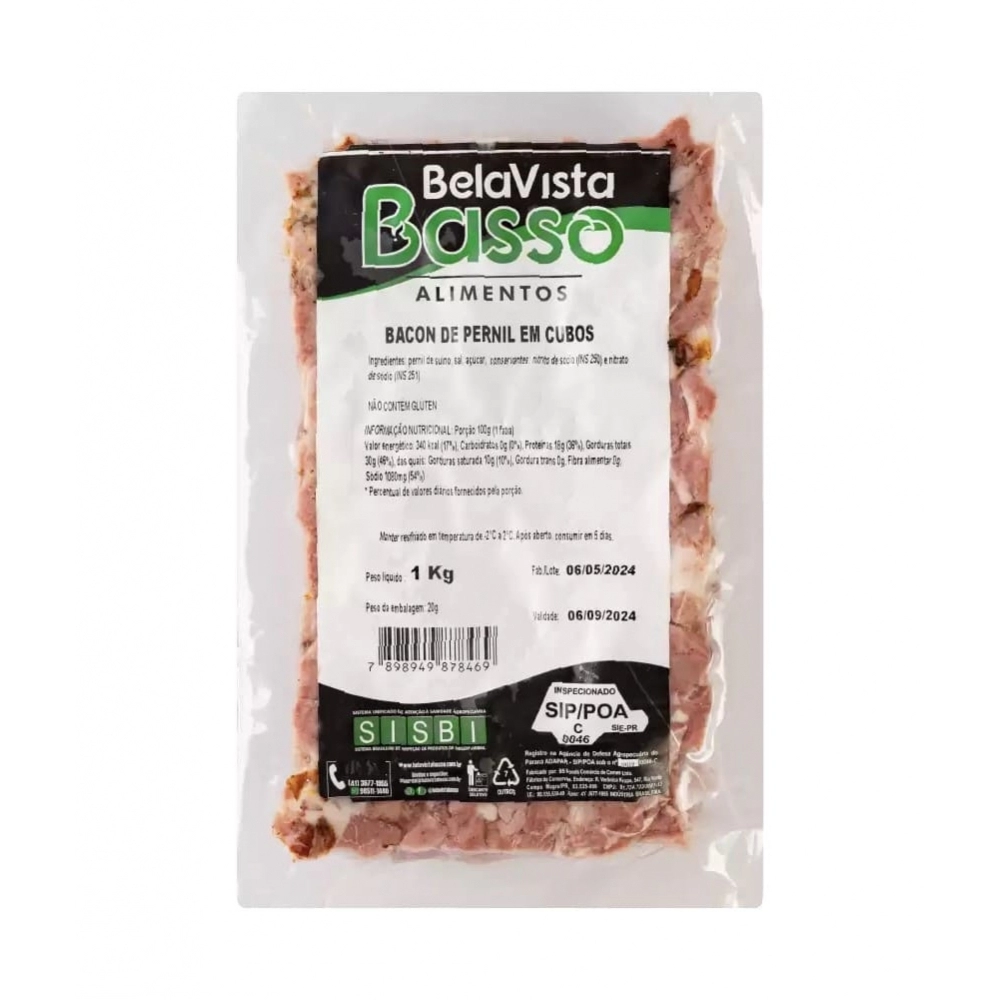 Bacon em Cubos Bella Vista 1kg O Bacon em Cubos Bella Vista é feito com cortes premium de carne suína, defumado lentamente com madeiras nobres para um sabor marcante e irresistível. Pronto para uso, os cubos são ideais para adicionar um toque defumado e crocante a diversas receitas. Perfeito para preparos rápidos, como saladas, omeletes, massas, ou como ingrediente-chave em pratos sofisticados! Validade: Consumir preferencialmente em até 7 dias após a abertura da embalagem (se refrigerado). Validade impressa na embalagem. Armazenamento:Mantenha sob refrigeração (entre 0°C e 4°C). Após aberto, armazene em recipiente hermético para preservar o sabor e a textura. Dica Chef Bella Vista:Doure os cubos de bacon em fogo médio até ficarem crocantes e use para incrementar risotos, pães de queijo recheados ou purê de batata. Experimente também salpicá-los sobre sopas cremosas ou misturar em farofas para um sabor extra! A Bella Vista entrega praticidade e qualidade para transformar suas receitas em experiências memoráveis!