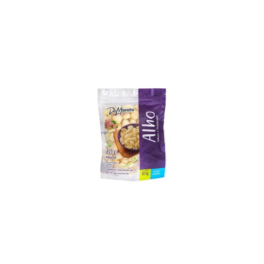 Alho Inteiro Descascado 300g – Marchi O Alho Inteiro Descascado Marchi é a solução prática para quem busca agilidade na cozinha sem abrir mão do sabor autêntico. Já descascado e pronto para uso, esse alho de alta qualidade mantém todo o aroma e propriedades naturais, ideal para temperos, molhos, carnes, massas e receitas gourmet. Embalado a vácuo para preservar a frescura, ele elimina a etapa trabalhosa de descascar e cortar, economizando tempo no preparo das refeições. Validade:12 meses a partir da data de fabricação (verifique o lacre da embalagem). Uma vez aberto, consumir em até 7 dias, mantendo sob refrigeração.Armazenamento:Antes de abrir: Guarde no freezer (-18°C) para maior durabilidade. Após aberto: Transferir para um pote hermético e refrigerar (0°C a 4°C). Evite expor à umidade ou luz solar direta para preservar o sabor.Dica Gourmet:Aromatize azeites: Fatie finamente o alho e aqueça em azeite extravirgem em fogo baixo até dourar. Use para regar pizzas, bruschettas ou risotos. Pasta de alho: Amasse os dentes com sal, limão e ervas (salsinha ou alecrim) para um creme versátil. Assados premium: Espalhe dentes inteiros junto a carnes assadas (como cordeiro ou frango) para um perfume irresistível.Por que escolher?Praticidade: 100% descascado e sem desperdício. Qualidade Marchi: Seleção rigorosa de alho fresco, sem conservantes artificiais. Versatilidade: Do dia a dia aos pratos sofisticados.Leve o sabor intenso do alho para sua cozinha com a comodidade que só a Marchi oferece!